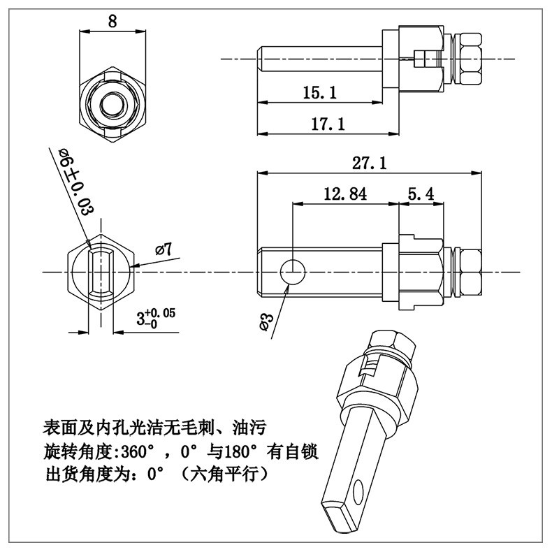 臺(tái)燈金屬支架轉(zhuǎn)軸的軸套為六邊形,軸件銑扁,裝配時(shí)從臺(tái)燈活動(dòng)關(guān)節(jié)一側(cè)壓入即可使用,軸件固定,軸套轉(zhuǎn)動(dòng)。
