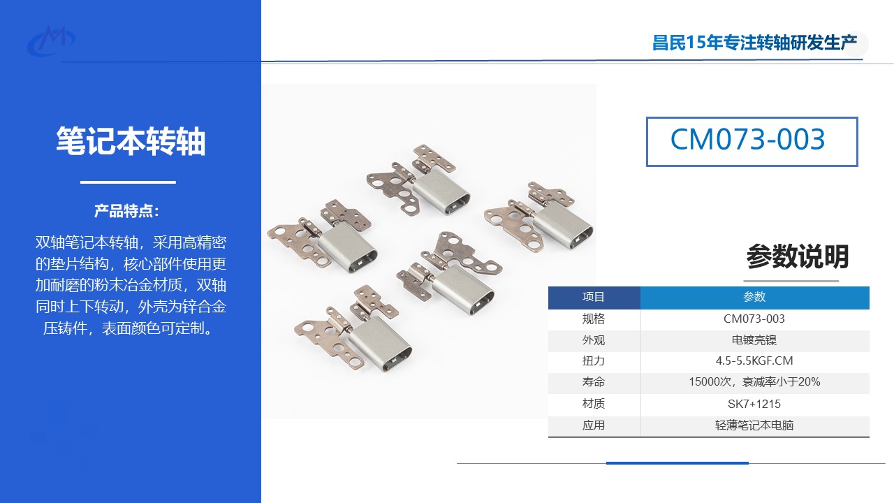 手機:133-4266-6888隨著筆記本電腦更輕、更薄的發展,轉軸的結構設計也在不斷變化。筆電轉軸是典型的活動部件,既要承受彎矩又要承受扭矩,對開合體驗起了決定性的影響,從隱藏在筆記本電腦中的經典墊圈結構轉軸到現在帶殼的齒輪結構轉軸,筆記本電腦在翻轉時可以靈活地切換角度,更便于攜帶。目前我們經常可以看到帶殼的筆記本電腦轉軸,這樣的結構設計有有什么功能和優勢呢?今天昌民小編就帶大家了解一下。